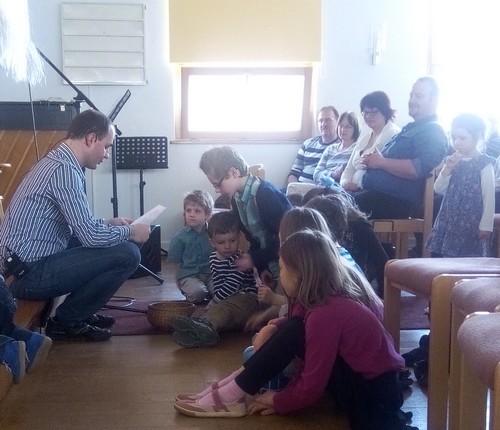 Der Gottesdienst wurde von Tobias Schmitt und Jochen Schmid gestaltet. Die Kinder waren aufgefordert 12 Ostereier zu suchen, die im Gottesdienstraum versteckt waren. Alle Eier wurden gefunden. In diesen Ostereiern befanden sich Bilder zur Passionsgeschichte. Anhand dieser Bilder hat Tobias erzählt, wie Jesus leiden und sterben musste und am dritten Tag auferstanden ist. So wie es in der Bibel berichtet ist.