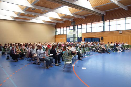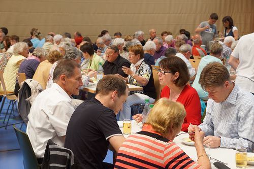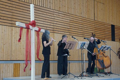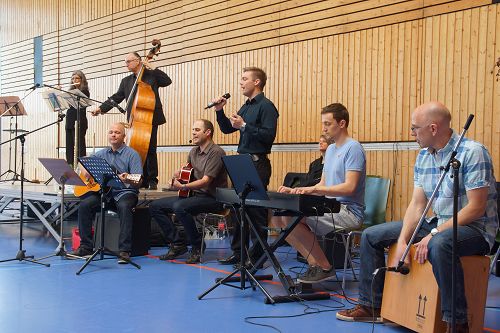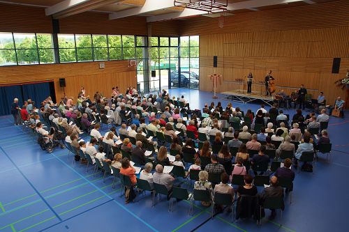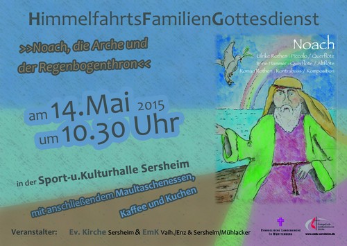 An Christi Himmelfahrt versammelten sich, wie schon seit einigen Jahren, die Evangelische Kirche Sersheim, die Evangelisch-methodistische Kirche Sersheim und die Evangelisch-methodistische Kirche Vaihingen/Enz zu einem gemeinsamen Gottesdienst in der Sport- und Kulturhalle Sersheim. Um 10:30 Uhr startete der besondere Gottesdienst zu dem Thema: „Noach, die Arche und der Regenbogenthron“, den die Musiker Irene Hammer, Ulrike Rothen und Roman Rothen mitgestalteten. Mit dem Lied „Gott und König“ startete die Band den Gottesdienst. Nach Begrüßung und Gebet begann die musikalische Vorführung mit Irene Hammer an Querflöte und Altquerflöte, Ulrike Rothen an Piccoloflöte und Querflöte und Roman Rothen am Kontrabass. Sie nahmen uns hinein in den Bau der Arche und zeigten ihr Können an den Instrumenten, die sie auch studiert haben. Die Stücke wurden allesamt von Roman Rothen selbst komponiert und bringen sein eigenes Verständnis der Geschehnisse um die Arche Noah ein. So konnten die Kindern beim Einzug der Tiere auf die Arche mit raten, welche Tiere den Weg auf die Arche gefunden haben. Vom rosaroten Panther, über den Löwen bis zum weißen Hai gab es einige Darbietungen, die Erraten werden konnten und für Lacher sorgten. Beim aufkommenden Sturm und Regenfall ließen die Künstler, verteilt in der Halle, ein nochmal ganz anderes Erlebnis der Flut aufkommen. Durch das Nacherzählen der Geschichte zwischen den Musikstücken konnten die Kinder gut verstehen, was sich zu Noahs Zeiten zutrug und so war die Arche nach einer etwa 30-minütigen musikalischen Reise auch wieder auf festem Boden gelandet. Das letzte Musikstück als Darbietung des Regenbogens schloss das Gesamtwerk ab. Der nachfolgende Impuls von Peter Wittenzellner spielte nochmals auf den Regenbogen als Zeichen an, dass Gott uns sein Versprechen gibt, für uns zu sorgen und auch bei den schweren Geschehnissen der heutigen Zeit als guter Gott uns nah sein will. Beim anschließenden Maultaschenessen und Kaffee und Kuchen konnte die Gemeinschaft unter den verschiedenen Gemeinden genossen werden.
