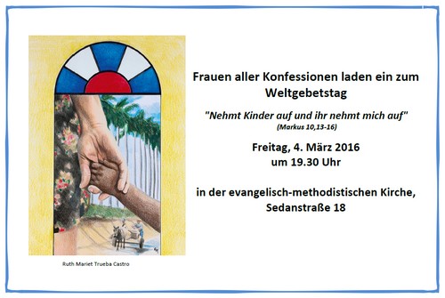 Dieses Wort aus dem Markusevangelium ist für die Frauen aus Kuba, die die Texte und Lieder des diesjährigen Gottesdienstes ausgewählt haben, sowohl Zusage als auch Aufforderung: Mit den Kindern, die Jesus empfängt und segnet, sind zugleich alle gemeint, die in der gesellschaftlichen Hierarchie ganz unten stehen. Im Gottesdienst beschreiben Mädchen und Frauen ihren Alltag: Sie wertschätzen das gute Bildungs- und Gesundheitswesen auf Kuba, teilen uns aber auch mit, wie die wirtschaftliche Krise und die anhaltende Auswanderung die Familien belastet. Wie im Titelbild ausgedrückt, so hoffen sie, dass sich dabei Fenster öffnen, Mauern fallen und Menschen aller Hautfarben und aller Generationen gemeinsam in eine bessere Zukunft gehen können. Der Weltgebetstag ist eine weltweite, ökumenische Basisbewegung christlicher Frauen. Das Herzstück ist ein Gottesdienst, den jedes Jahr Frauen eines anderen Landes vorbereiten. Der christliche Glaube, Gebet und Handeln für eine gerechte Welt gehören beim Weltgebetstag untrennbar zusammen.