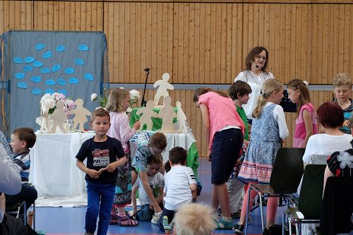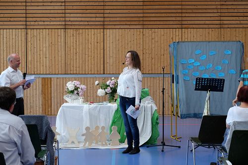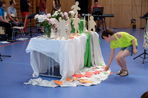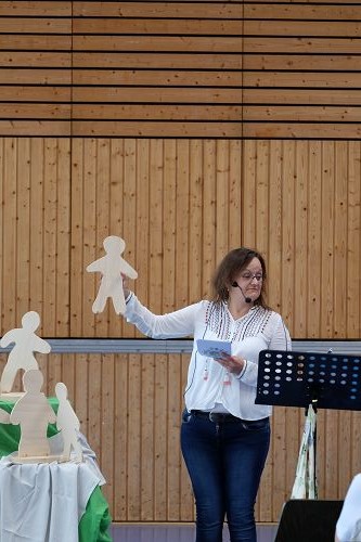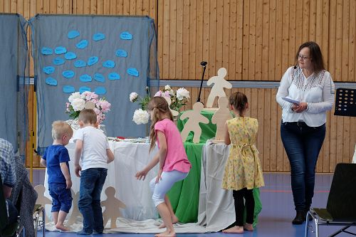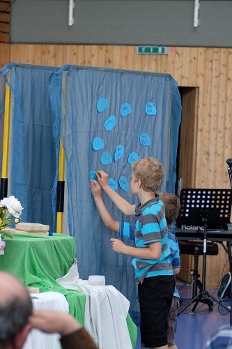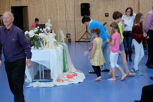 Dann erzählte Karin Todt, Referentin für Kinder- und Jugendarbeit, die Geschichte von der Himmelfahrt Jesu. Wie er auf einmal da war, und wie er mit seinen Jüngern noch einmal gesprochen hatte. Und wie er dann auf einmal weg war – und eben doch nicht weg, weil er unsichtbar ja immer da ist. Einige Kinder lagen bei der Erzählung vorn auf dem Boden, andere hörten auf ihren Stühlen bei Eltern oder Großeltern gespannt zu.